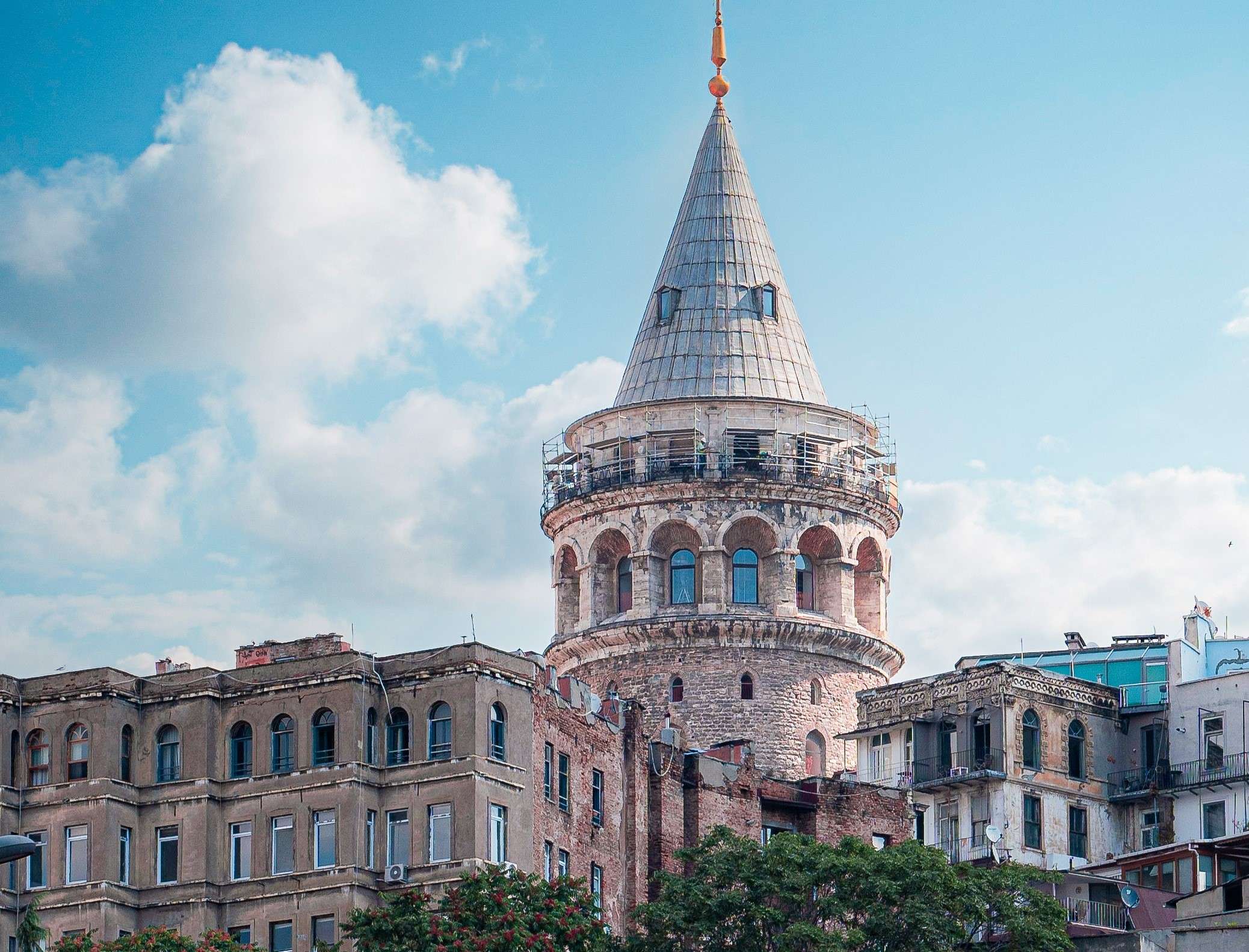 Galata Tower is a cylindrical stone tower with a conical roof. It stands 63 meters tall. The tower has a total of nine floors, including the observation deck, which offers panoramic views of Istanbul.